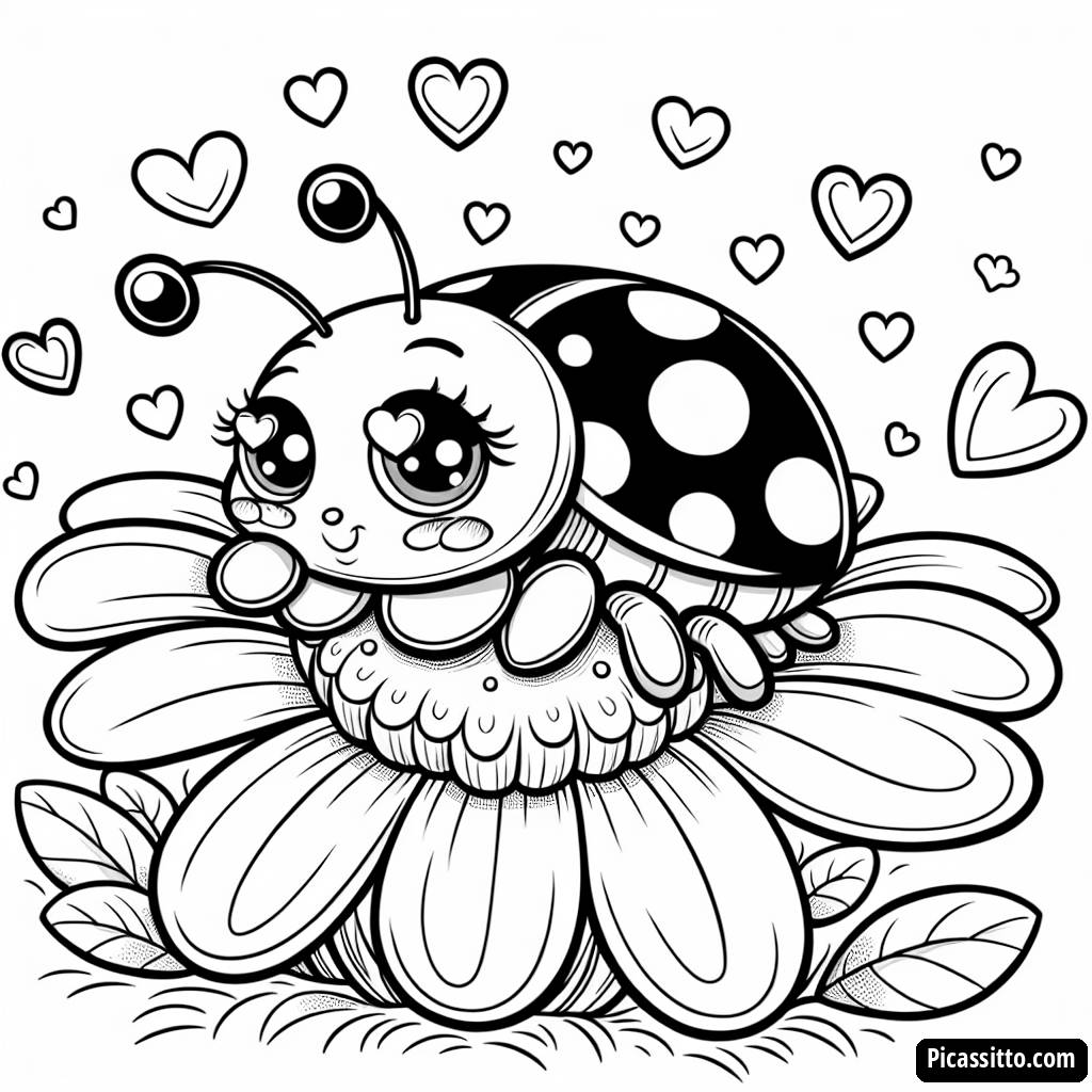 Laden Sie dieses kostenlose Ausmalbild vom Liebeskäfer herunter, das einen niedlichen Käfer mit großen Augen zeigt, der auf einer Blume sitzt, umgeben von Herzen – perfekt für den Spaß am Valentinstag!