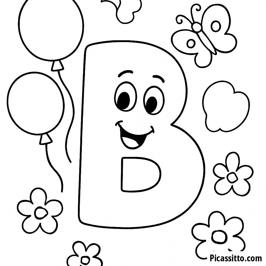 Genießen Sie dieses kostenlose und druckbare Ausmalbild mit dem fröhlichen Buchstaben 'B', umgeben von bunten Ballons und Schmetterlingen. Perfekt, um die Kreativität der Kinder zu fördern!