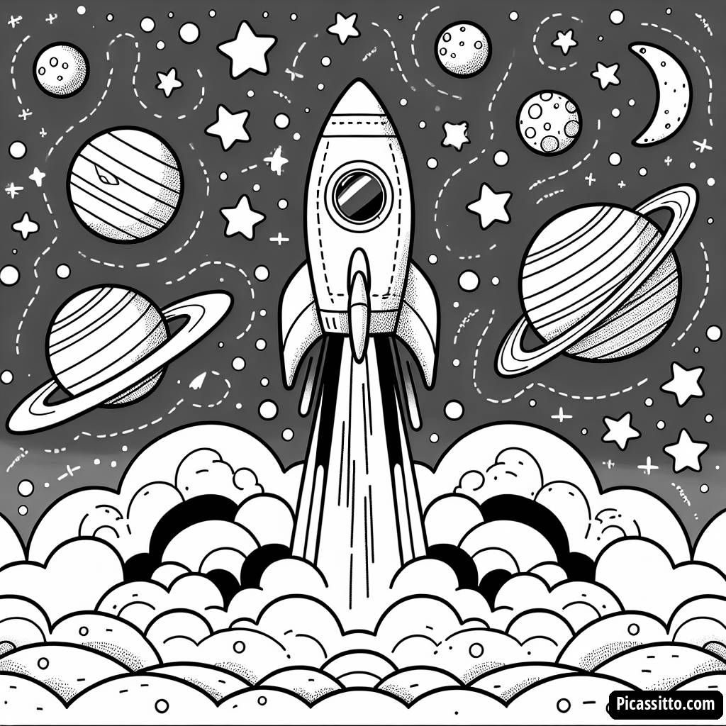 Laden Sie diese kostenlose und druckbare Rakete Ausmalbild herunter, das eine Rakete zeigt, die mit bunten Planeten im Hintergrund abhebt!