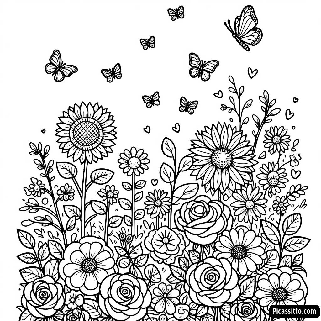 Entdecke die Schönheit der Natur mit unserem kostenlosen Ausmalbild eines blühenden Gartens, das lebendige Rosen, Sonnenblumen, Gänseblümchen und flatternde Schmetterlinge zeigt.
