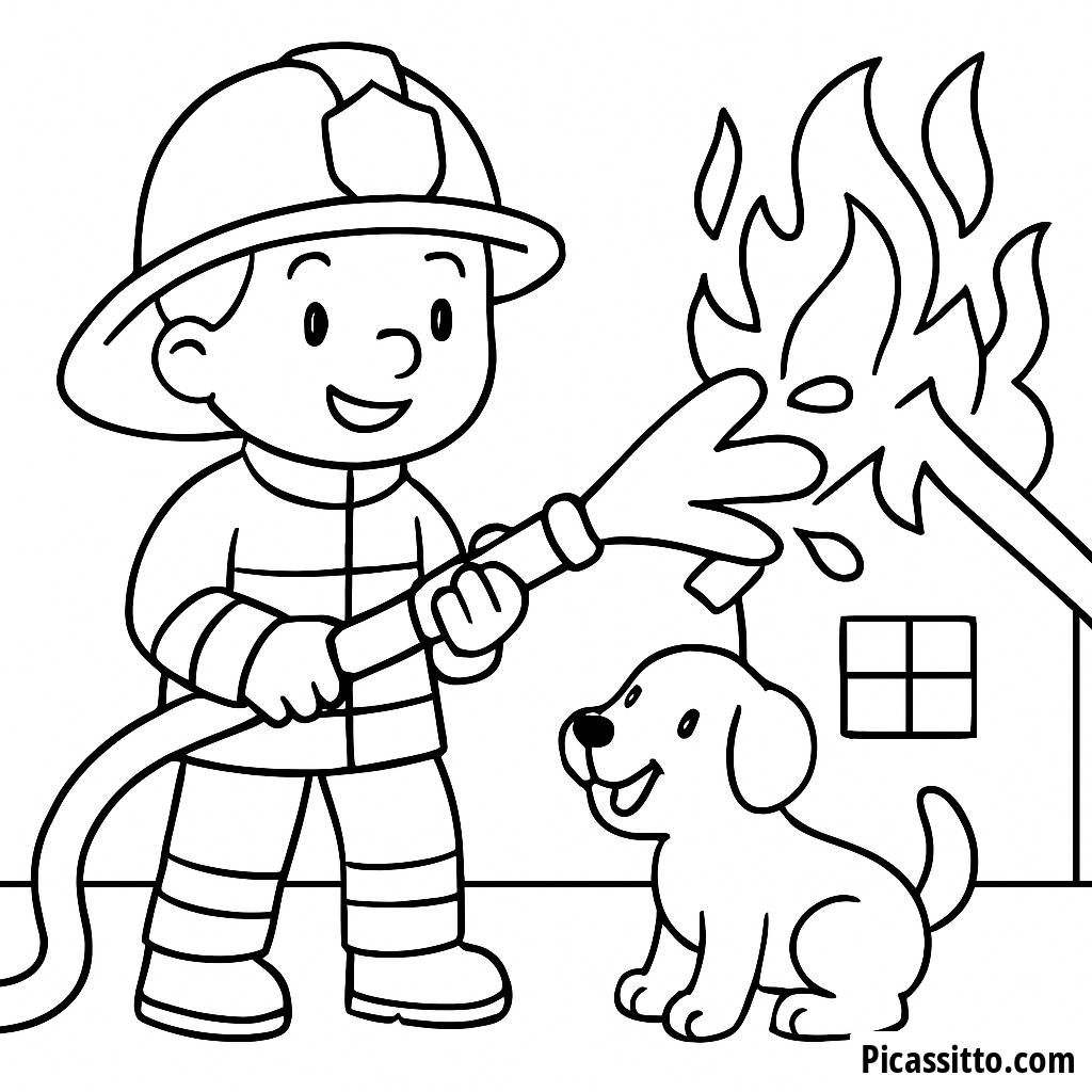 Genießen Sie diese kostenlose und druckbare Malvorlage mit einem mutigen Feuerwehrmann, der Wasser auf ein kleines Feuer spritzt, während ein niedlicher Welpe in der Nähe ist!