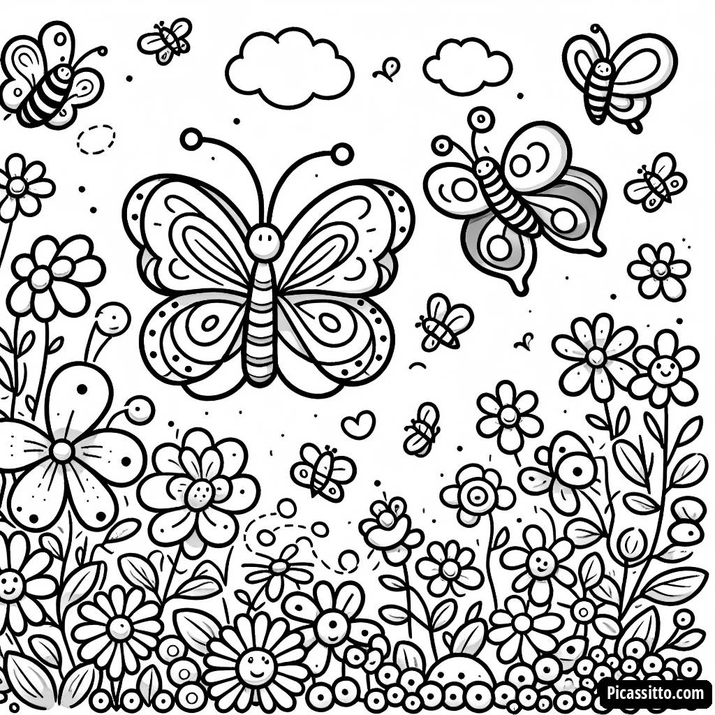 Genießen Sie eine bezaubernde Malvorlage des Schmetterlingsgartens, gefüllt mit schönen Blumen und summenden Bienen! Diese druckbare Seite ist kostenlos, damit Kinder ihrer Kreativität freien Lauf lassen können.