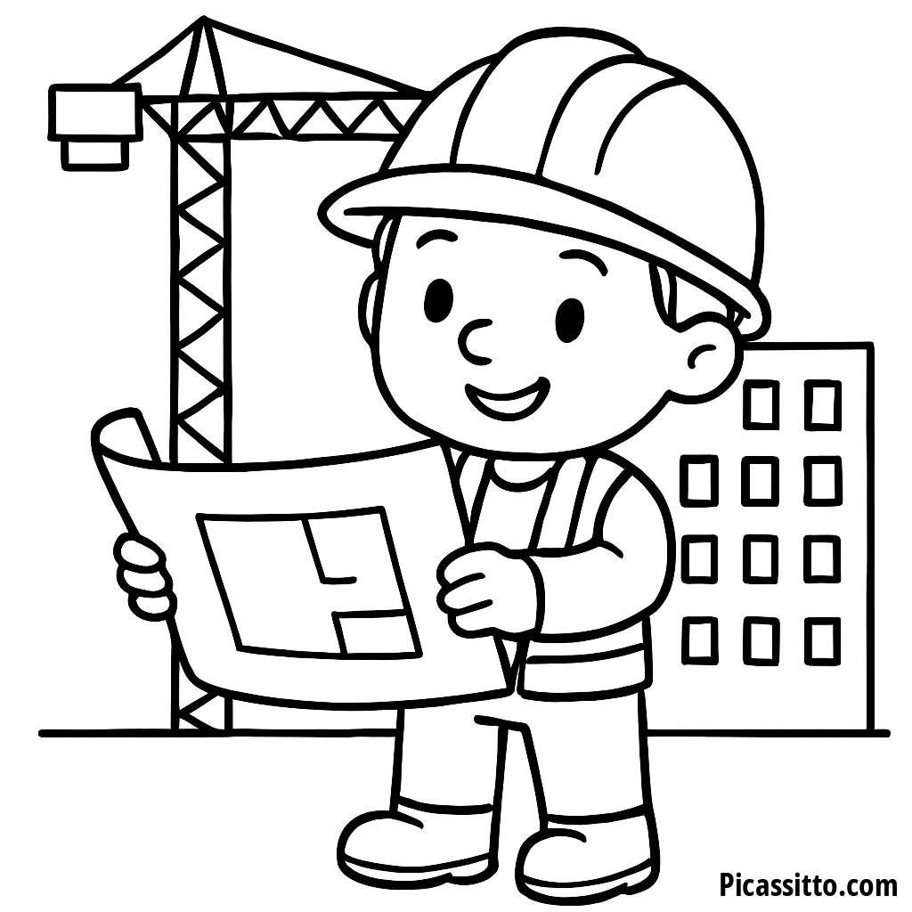 Lade diese kostenlose und druckbare Malvorlage mit einem fröhlichen Bauarbeiter herunter, der einen Bauplan hält, mit einem Kran und einem Gebäude im Hintergrund.