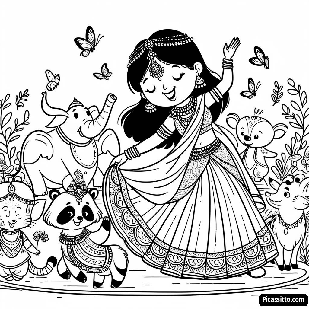 Genießen Sie diese kostenlose und druckbare Malvorlage mit einer schönen Prinzessin, die mit Waldtieren tanzt. Perfekt für kleine Künstler, um ihre Kreativität auszudrücken!