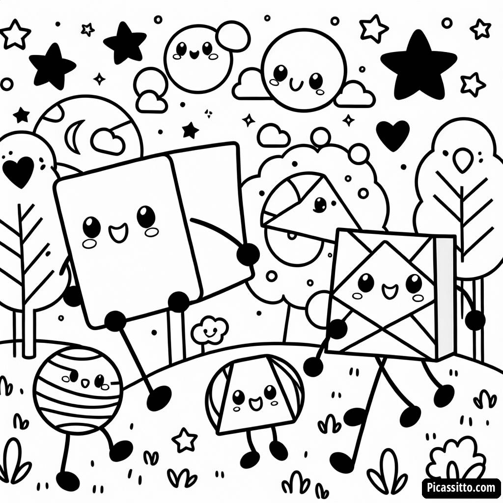 Lade diese kostenlose und druckbare Malvorlage mit tanzenden Formen herunter, die Kreise, Quadrate, Dreiecke und Sterne zeigt, die im Park Spaß haben!