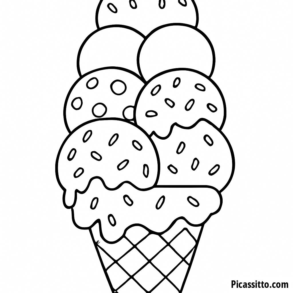 Genieße dieses kostenlose und druckbare Ausmalbild mit einer riesigen Eistüte, die mit bunten Kugeln und Streuseln garniert ist, für stundenlangen kreativen Spaß!