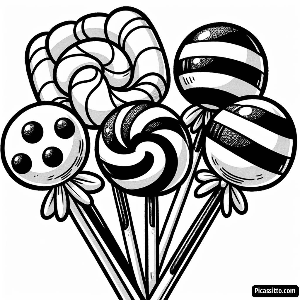 Mach dich bereit für Spaß mit unserem kostenlosen Ausmalbild, das fünf bunte Lollipops in verschiedenen Formen und Größen zeigt!