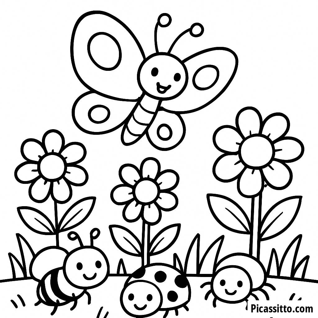 Laden Sie dieses kostenlose Ausmalbild von einem Schmetterling, der Flattert, herunter, perfekt für Kinder, die Insekten lieben! Sehen Sie, wie sie den Schmetterling und die lächelnden Käfer in einem wunderschönen Blumenfeld ausmalen.