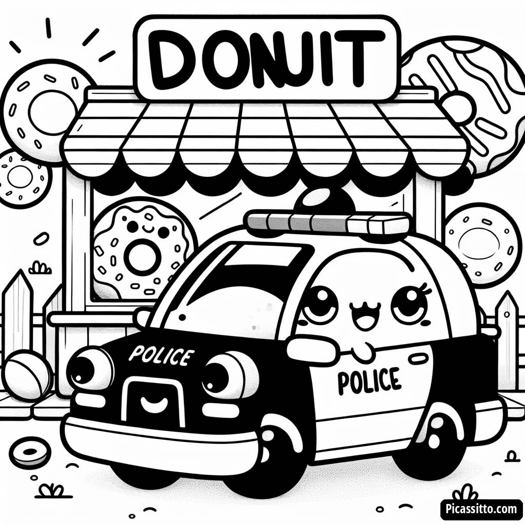 Laden Sie dieses kostenlose und ausdruckbare Ausmalbild herunter, das ein freundliches Polizeiauto zeigt, das neben einer Donut-Bäckerei parkt – perfekt für junge Künstler!