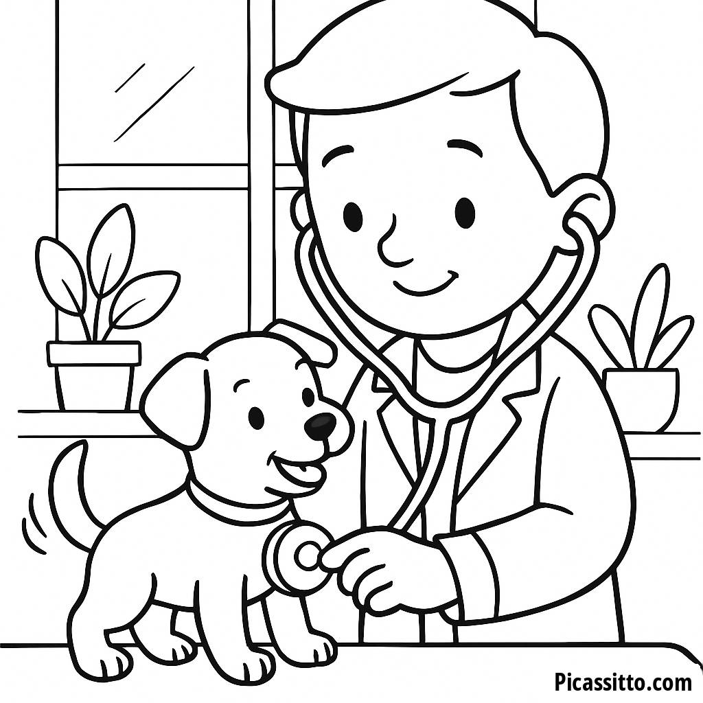 Genießen Sie dieses kostenlose und druckbare Ausmalbild mit einem freundlichen Tierarzt, der einen verspielten Welpen untersucht. Perfekt für kleine Tierliebhaber!