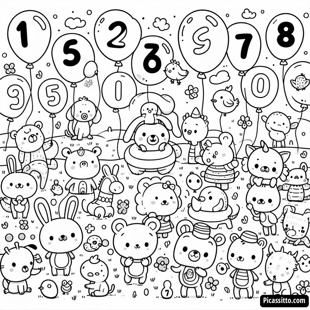 Laden Sie diese kostenlose und druckbare Ausmalbild mit spielerischen Tieren und nummerierten Ballons von 0 bis 9 für Zählspaß herunter!