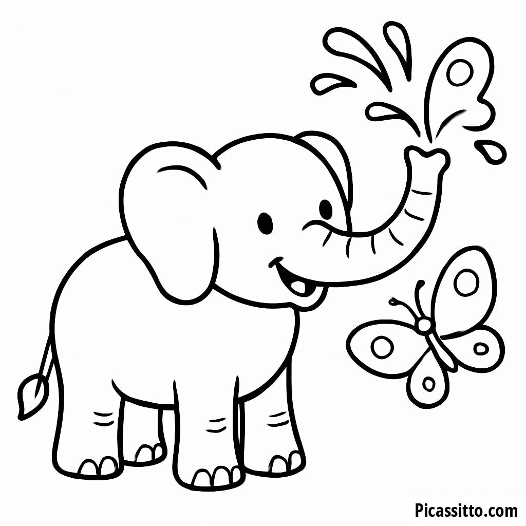 Genießen Sie dieses kostenlose und druckbare Ausmalbild mit einem verspielten Elefanten, der mit seinem Rüssel Wasser spritzt, und einem Schmetterling in der Nähe. Perfekt für Kinder, die Wildtiere lieben!