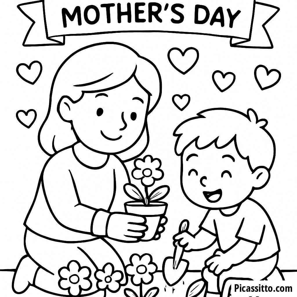 Feiere den Muttertag mit dieser kostenlosen und druckbaren Malvorlage, die eine Mutter und ihr Kind zeigt, die Blumen in einem Garten pflanzen, umgeben von Herzen und einem festlichen Banner.