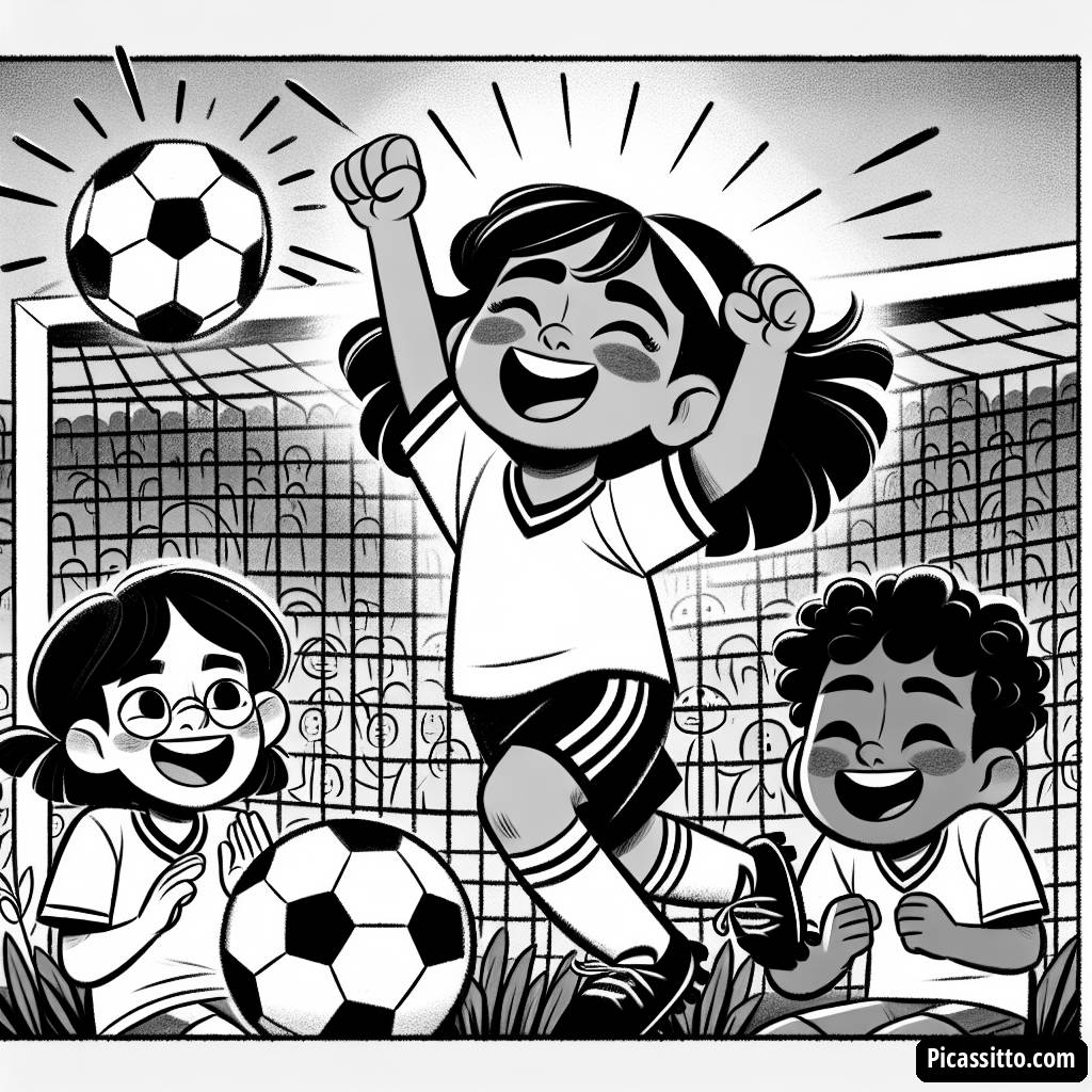 Lade dir dieses kostenlose und ausdruckbare Ausmalbild eines fröhlichen Kindes herunter, das in einem Fußballspiel ein Tor erzielt, umgeben von jubelnden Freunden!