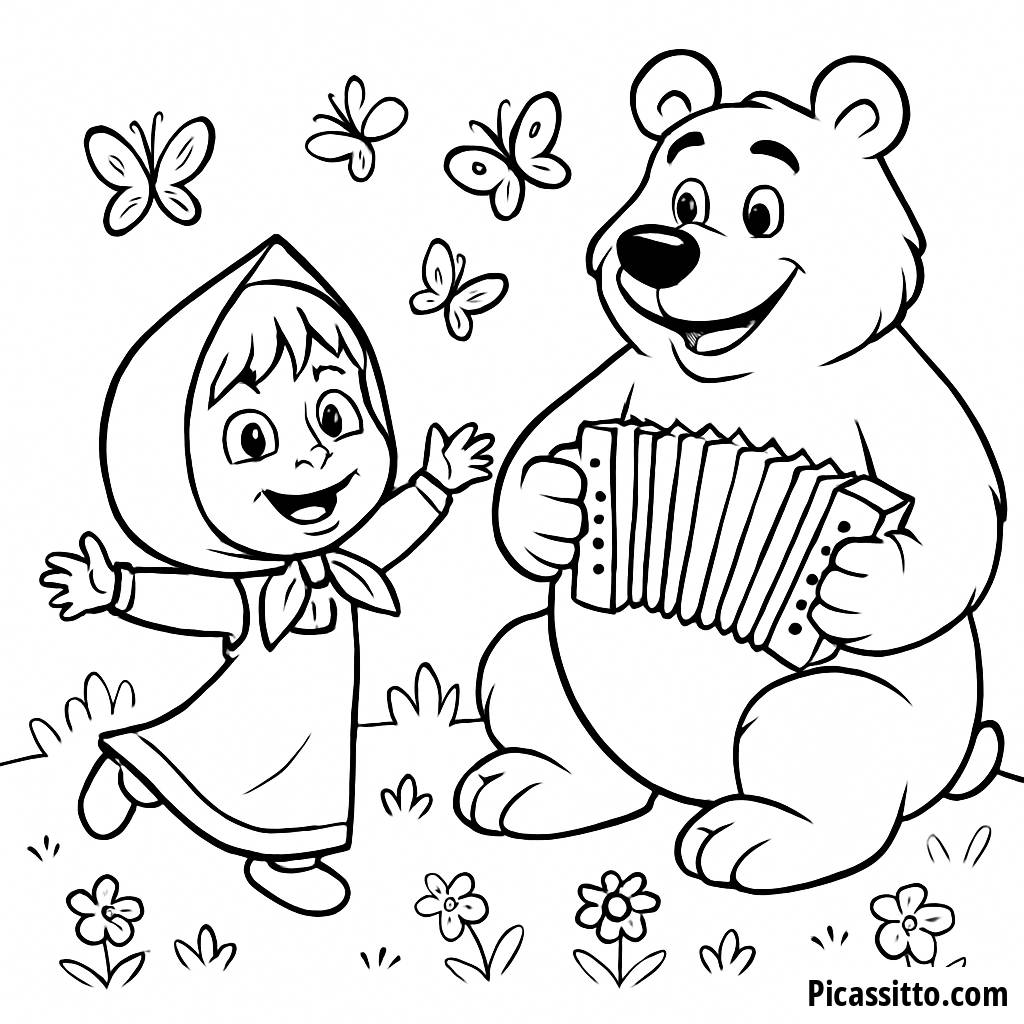 Lade dir diese kostenlose und druckbare Malvorlage von Masha, die mit Schmetterlingen tanzt, während der Bär Akkordeon spielt, herunter. Perfekt für kleine Künstler!