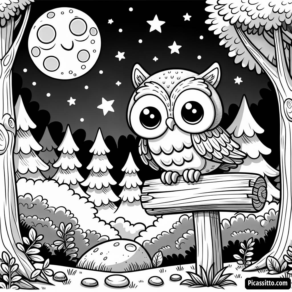 Genießen Sie dieses kostenlose und druckbare Ausmalbild der Eule im Mondschein, das eine Eule zeigt, die auf einem Holzschild in einem ruhigen Wald sitzt. Ideal für Kinder, um ihrer Kreativität freien Lauf zu lassen!