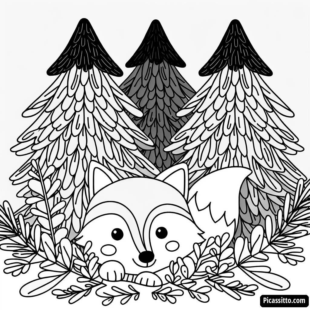 Genießen Sie dieses kostenlose und druckbare Ausmalbild mit einem verspielten Fuchs, der zwischen einer Gruppe von Kiefern versteckt ist! Perfekt, um die Kreativität junger Künstler zu fördern.
