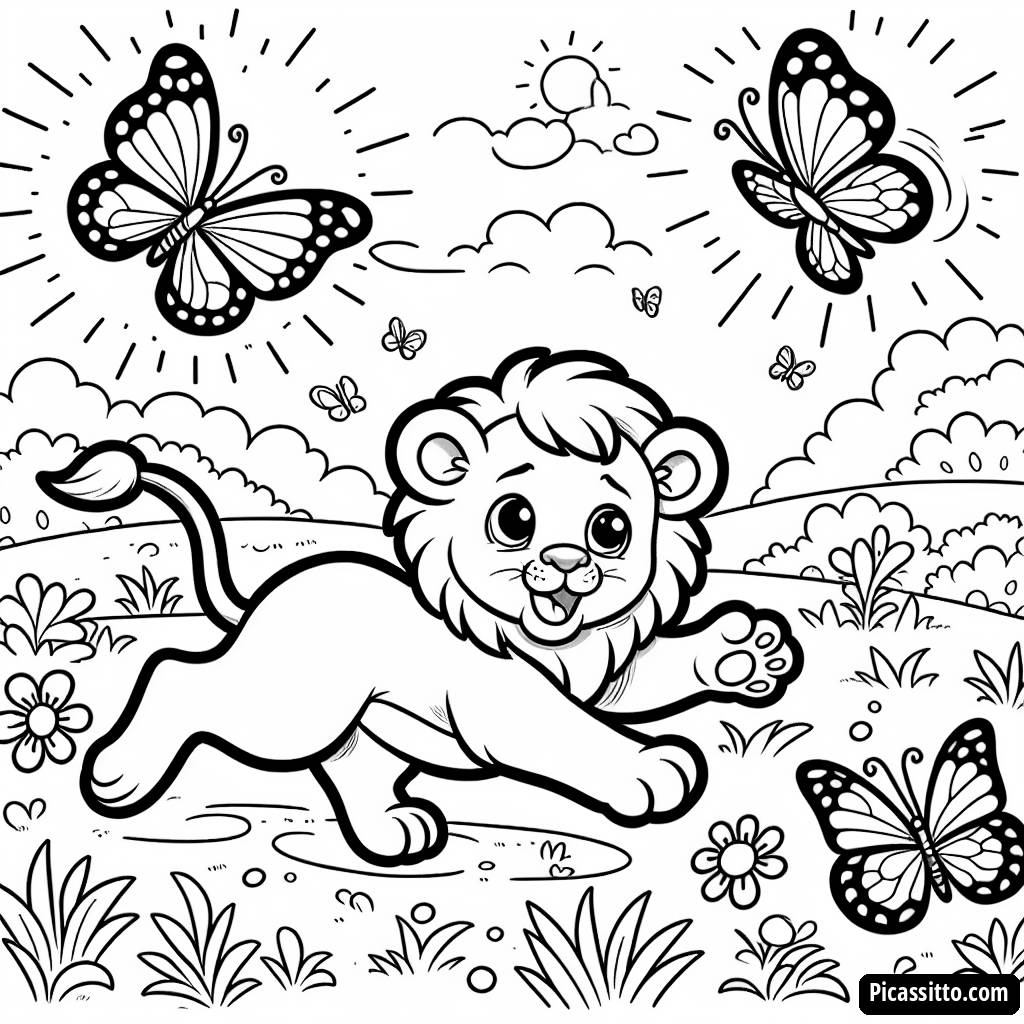 Laden Sie diese kostenlose und druckbare Ausmalseite mit einem verspielten Löwenjunges herunter, das Schmetterlinge in einer sonnigen Savanne jagt. Perfekt für junge Tierliebhaber!
