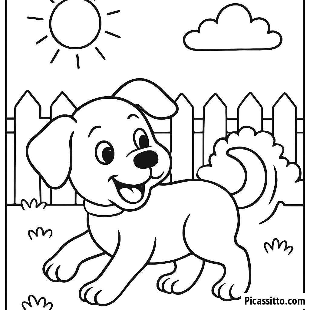Laden Sie diese kostenlose Ausmalbild eines verspielten Welpen herunter, der seinen Schwanz in einem sonnigen Garten jagt. Perfekt für junge Künstler!