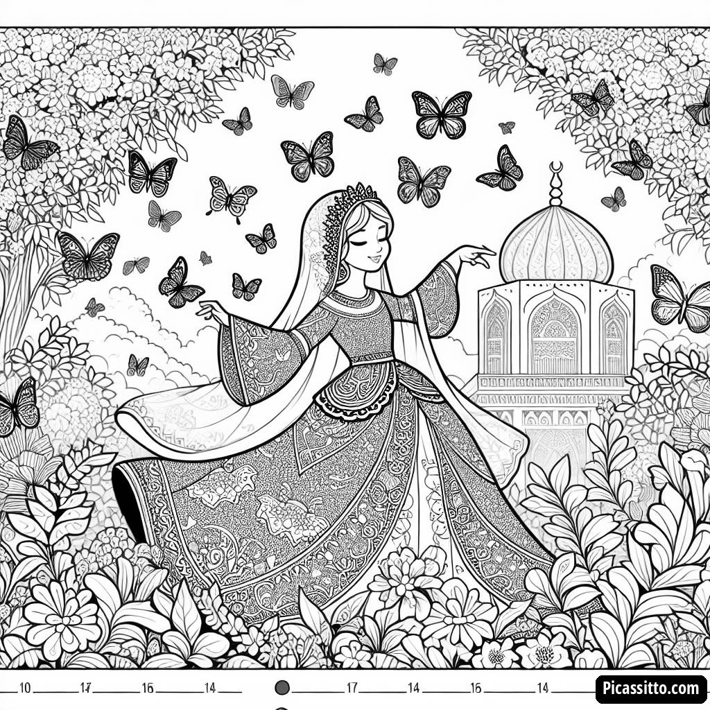 Genießen Sie diese kostenlose und druckbare Malvorlage, die eine Prinzessin zeigt, die in einem schönen Garten umgeben von Schmetterlingen tanzt. Ideal, um die Kreativität junger Künstler zu inspirieren!