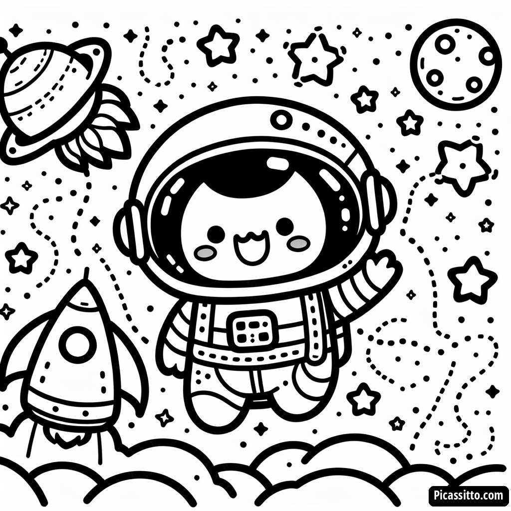 Laden Sie dieses kostenlose und druckbare Ausmalbild herunter, das einen Astronauten zeigt, der im Weltraum schwebt und unter den Sternen mit einem Raumschiff im Hintergrund winkt. Perfekt für junge Entdecker!