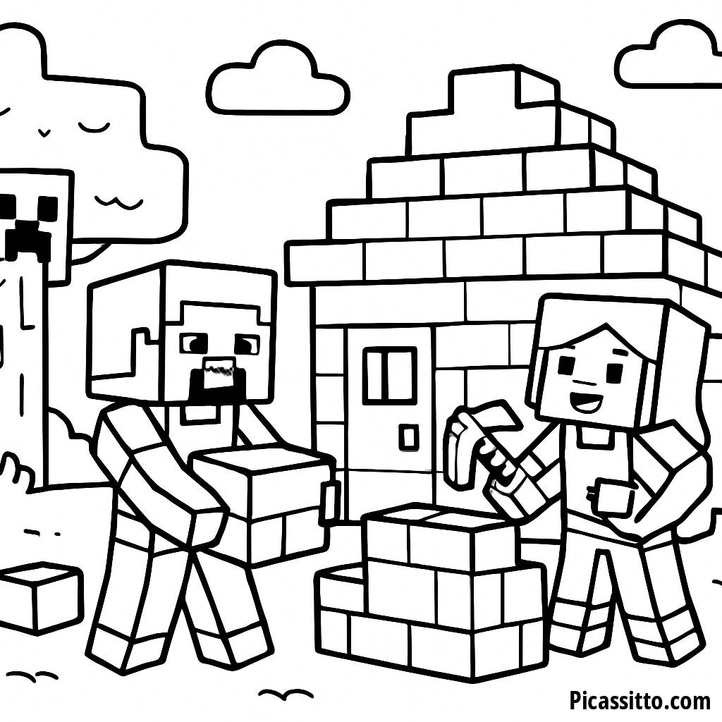 Viel Spaß mit dieser kostenlosen und druckbaren Malvorlage von Steve und Alex, die ein gemütliches Haus bauen, während ein schüchterner Creeper hinter einem Baum hervorschaut. Ideal für Minecraft-Fans!