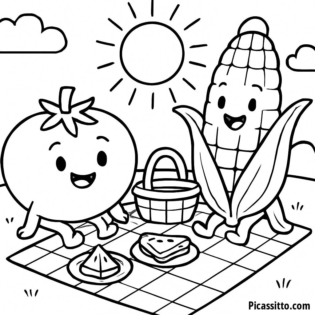 Genießen Sie eine kostenlose und druckbare Malvorlage mit einer fröhlichen Tomate und Mais, die ein tolles Picknick unter einem sonnigen Himmel haben!
