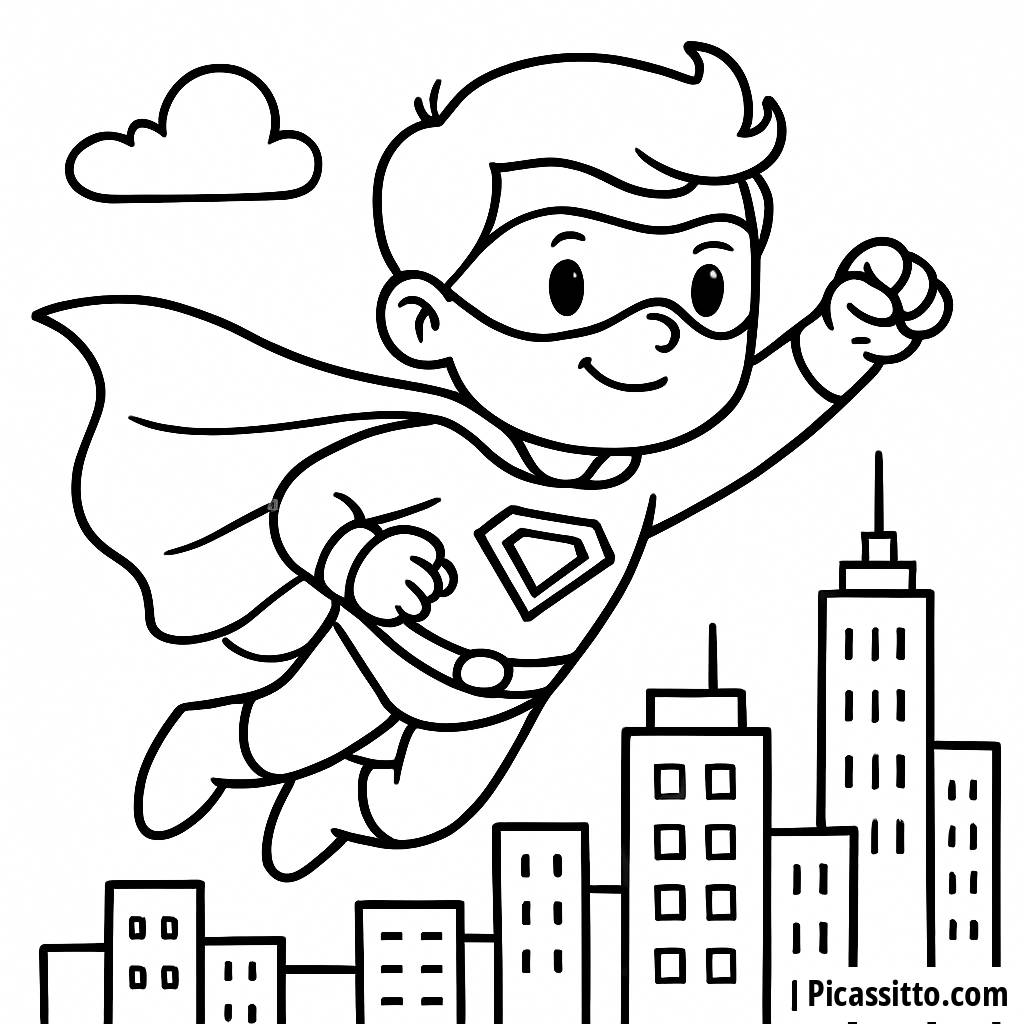 Laden Sie diese kostenlose und druckbare Malvorlage eines Superhelden herunter, der mit seiner wehenden Umhang über die Stadt fliegt.