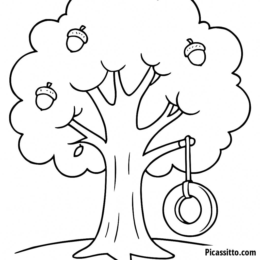 Ausmalbild eines hohen Eichenbaums mit einer schwingenden Reifen