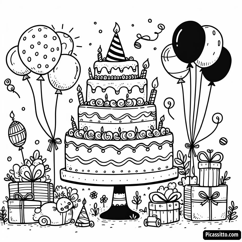 Lade diese kostenlose und druckbare Malvorlage von einer verspielten Geburtstagsparty herunter! Sie zeigt einen großen Kuchen, bunte Ballons und verstreute Geschenke für endlosen Spaß.