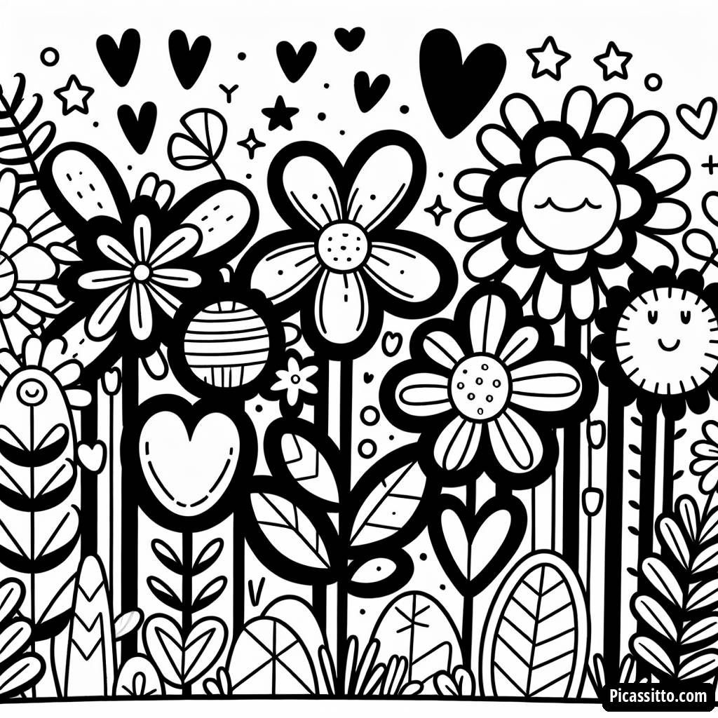 Entdecken Sie Ihre Kreativität mit unserer kostenlosen und druckbaren Malvorlage vom verspielten Blumengarten, in dem jedes Blütenblatt eine einzigartige Form wie einen Stern, ein Herz oder ein Oval hat!