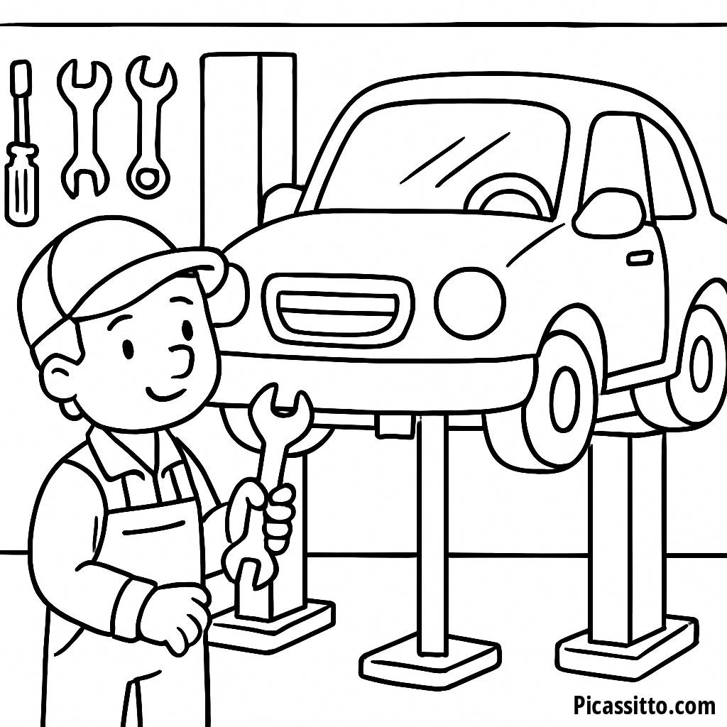 Download this free and printable busy garage coloring page featuring tools and a car on a lift, perfect for aspiring little mechanics!