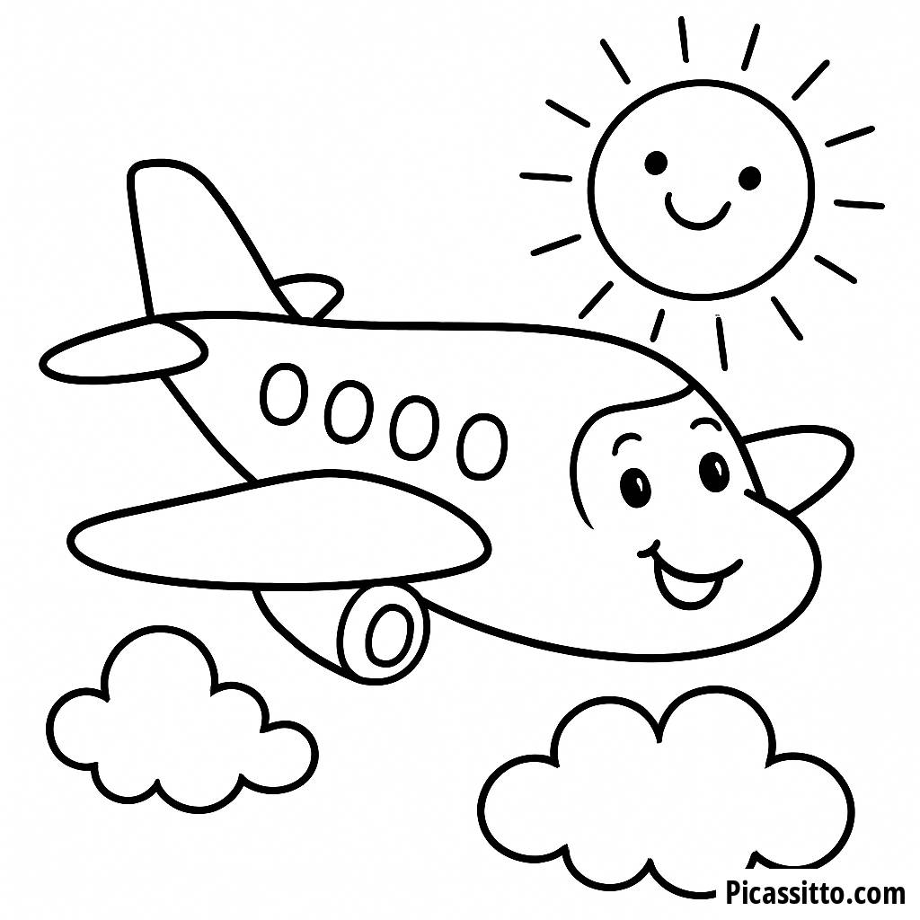 Enjoy this free and printable cheerful airplane coloring page, perfect for little pilots! Let your imagination soar as you color in the fluffy clouds and smiling sun.