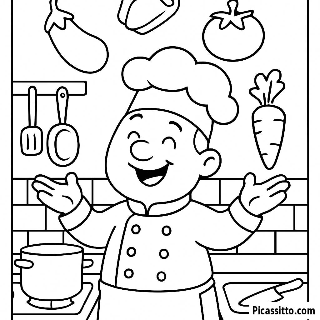 Download this free and printable cheerful chef juggling colorful vegetables coloring page for endless fun and creativity!