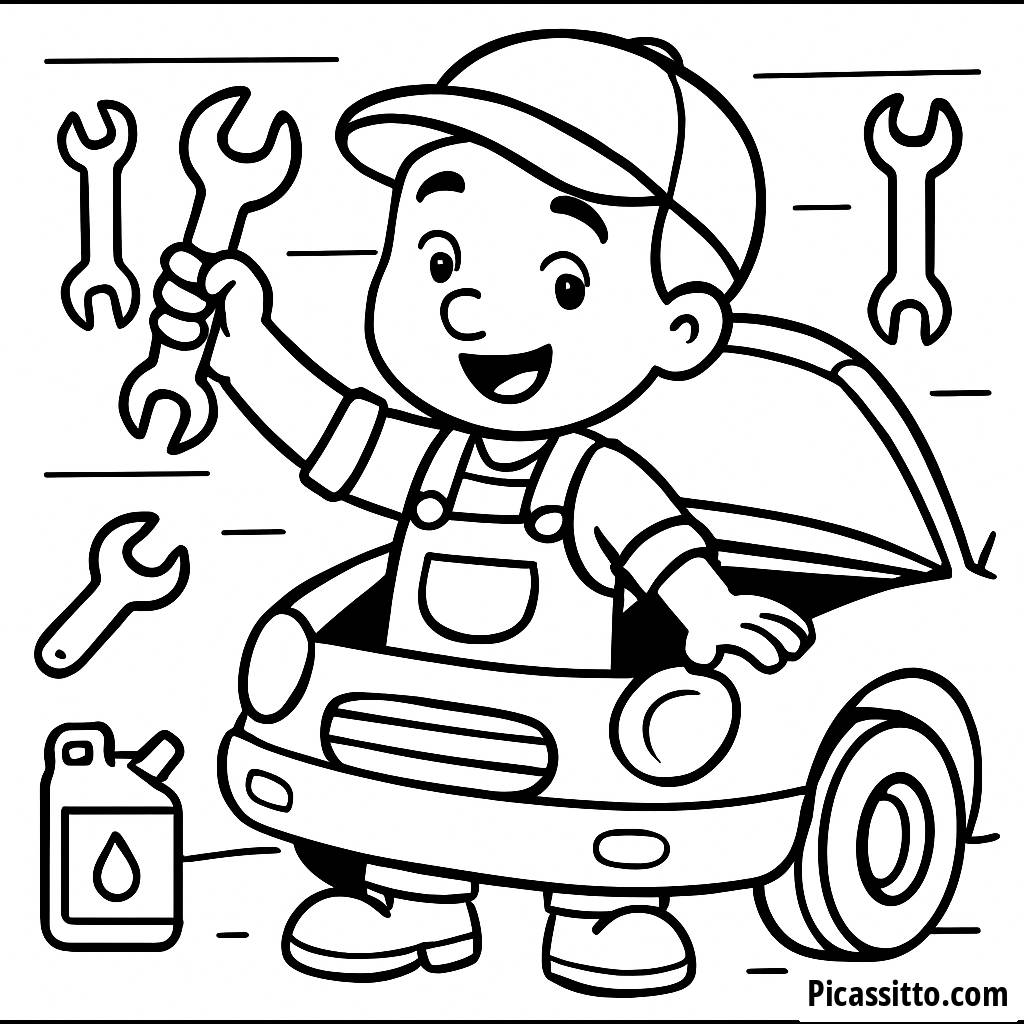 Download this free and printable cheerful mechanic coloring page, perfect for little hands who love cars and tools!