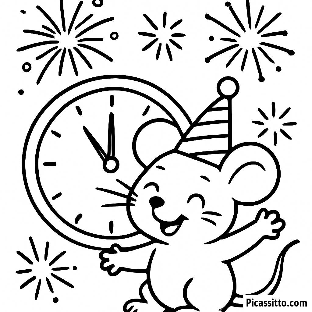 Celebrate the New Year with this cheerful mouse coloring page, featuring festive fireworks and a giant clock striking midnight. It's free and printable for endless coloring fun!