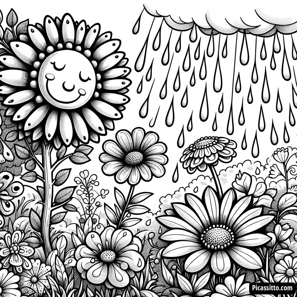 Enjoy this free and printable coloring page featuring cheerful raindrops falling on colorful flowers with a happy sun peeking through the clouds!