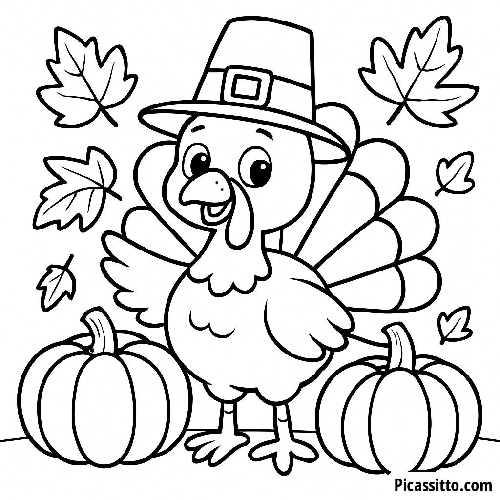 Download this free and printable cheerful turkey coloring page, perfect for Thanksgiving fun surrounded by pumpkins and autumn leaves!