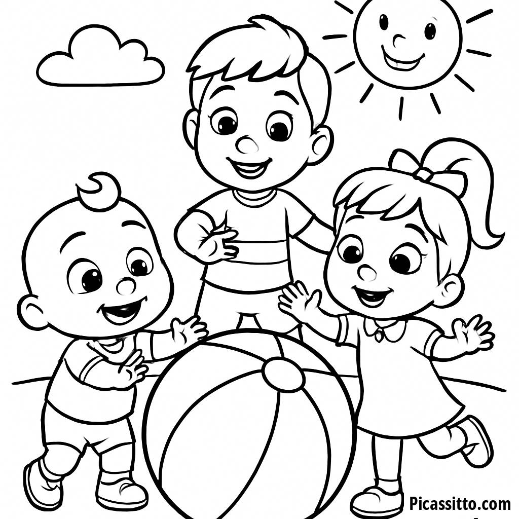 Cocomelon Coloring Page: JJ, TomTom, and YoYo Having Fun with a Beach Ball