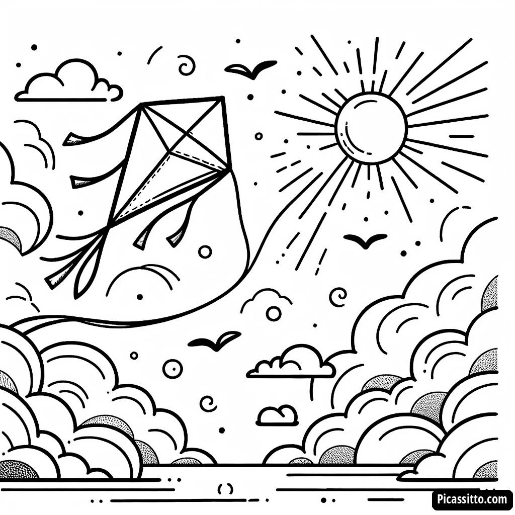 Coloring Page of a Wind-Blown Kite in the Sky