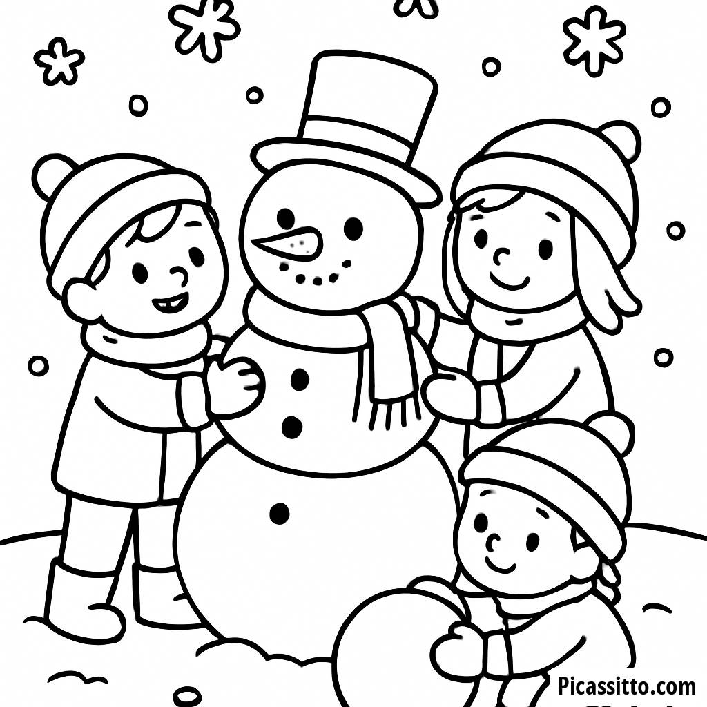 Enjoy this free and printable cozy winter scene coloring page featuring children building a snowman and snowflakes dancing in the air.