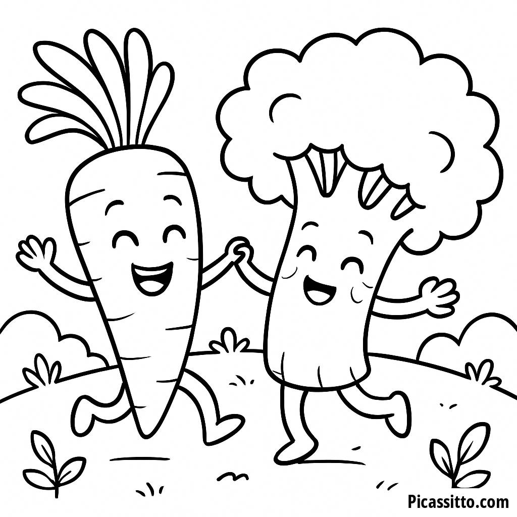 Get ready to color a cheerful carrot and broccoli dancing together in a vibrant garden! This coloring page is free and printable for endless fun.