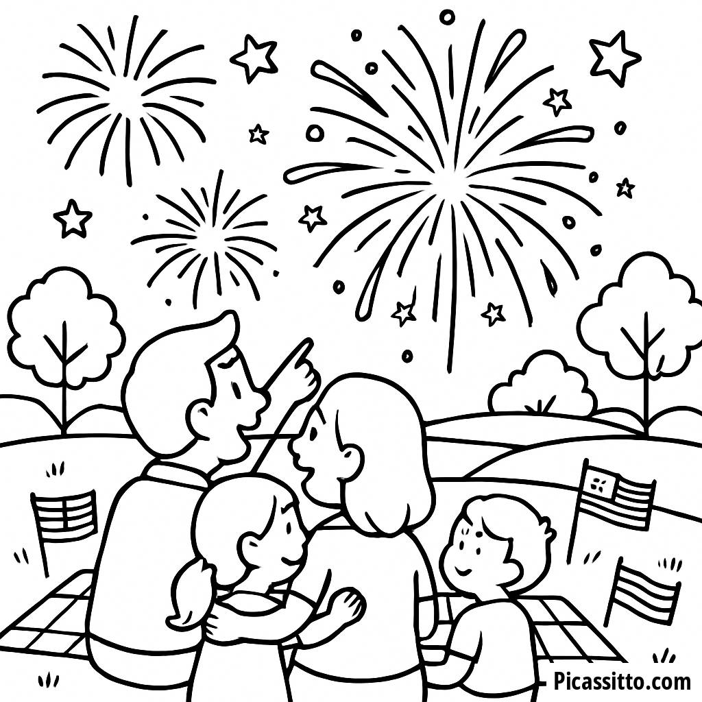 Enjoy this free and printable family fireworks coloring page, perfect for celebrating Independence Day with a colorful picnic scene!