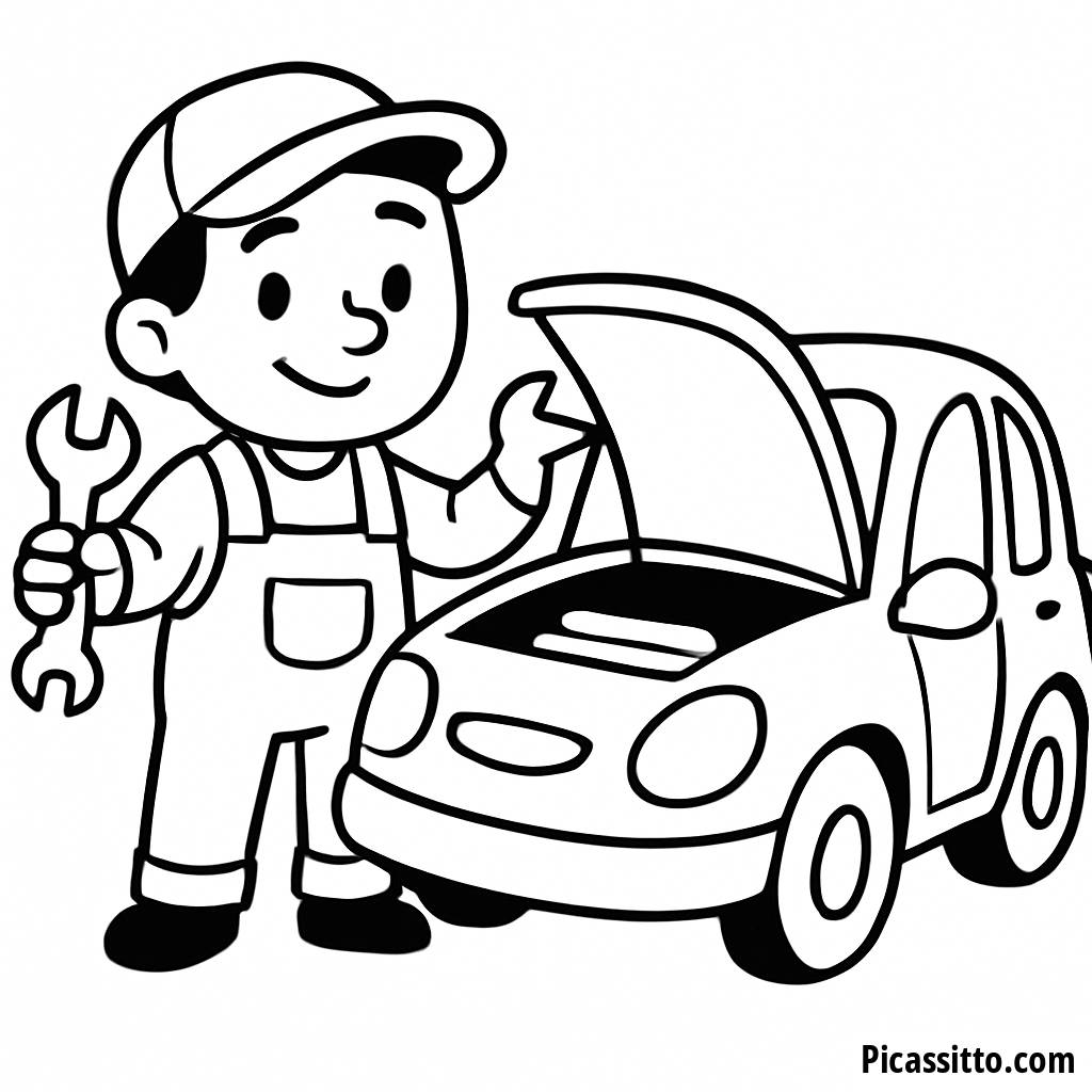 Download this free and printable coloring page featuring a friendly mechanic fixing a colorful car with a wrench in hand. Perfect for little car enthusiasts!