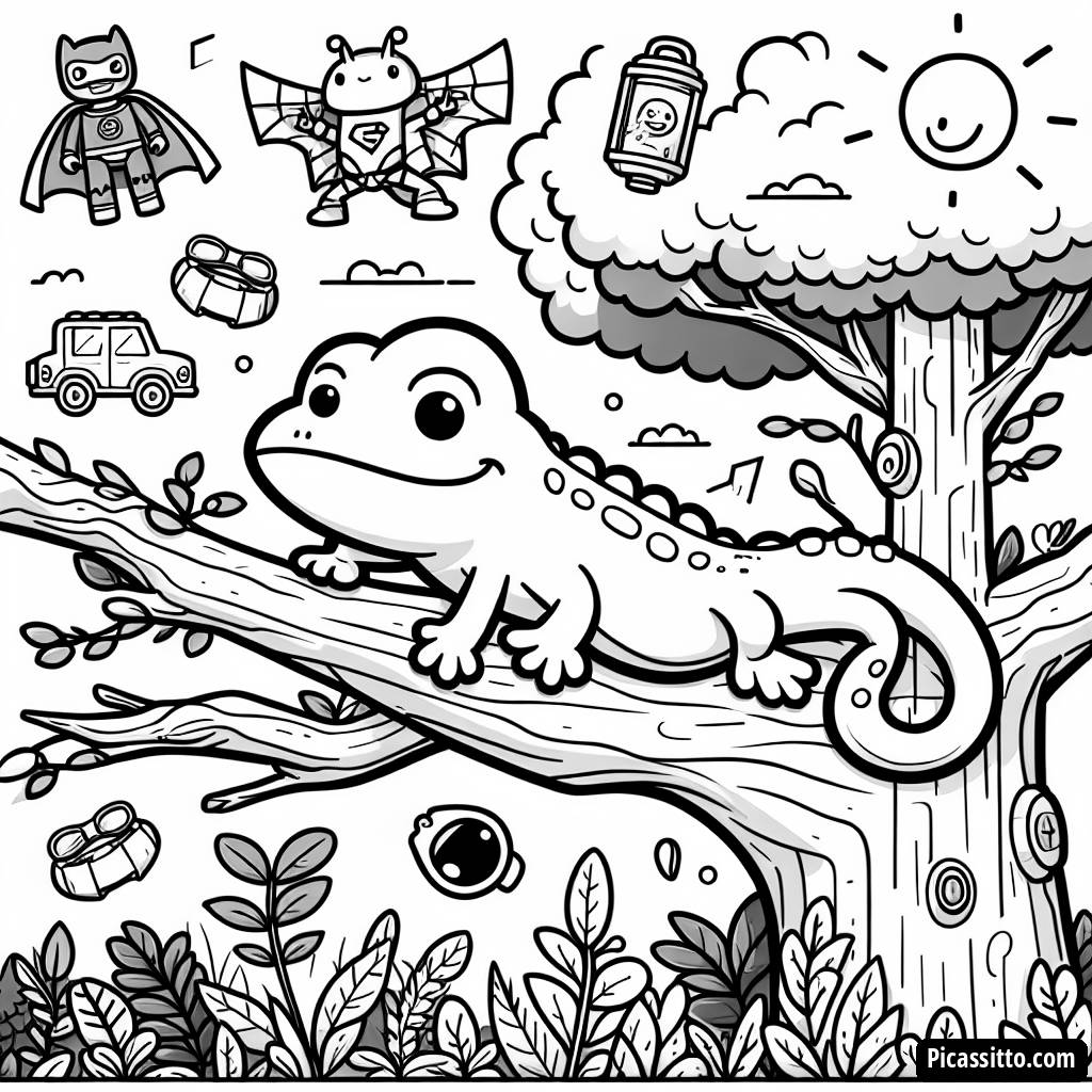 Download this free and printable Gekko's Superhero Adventure coloring page, featuring Gekko climbing a tree surrounded by cool superhero gadgets!