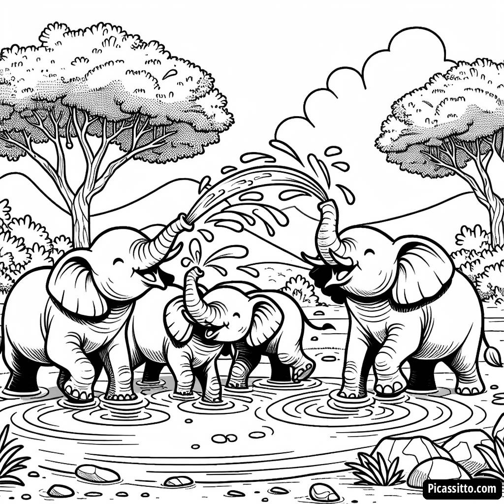Enjoy this free and printable coloring page featuring a group of happy elephants spraying water at a watering hole. Perfect for kids who love wild animals!