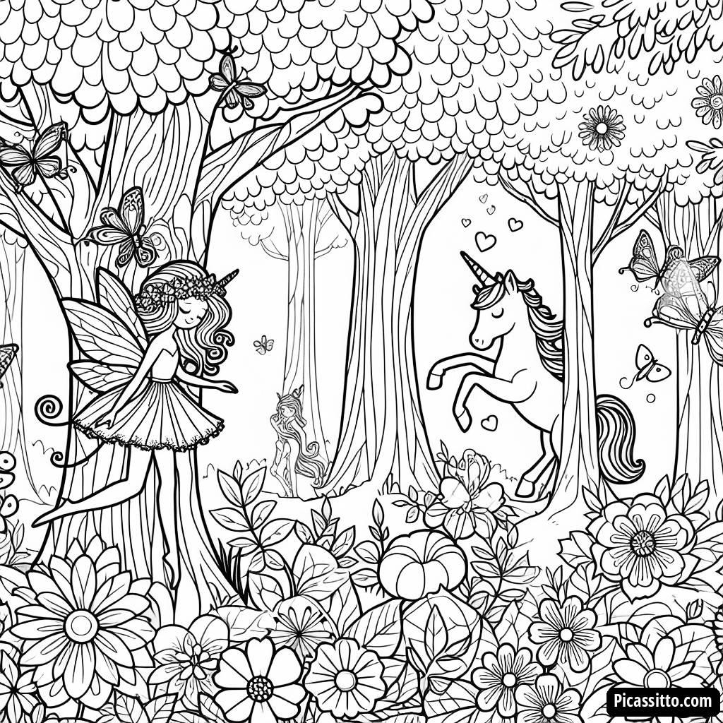 Join the adventure in a magical forest filled with dancing fairies and a curious unicorn! This free and printable coloring page is perfect for sparking creativity.