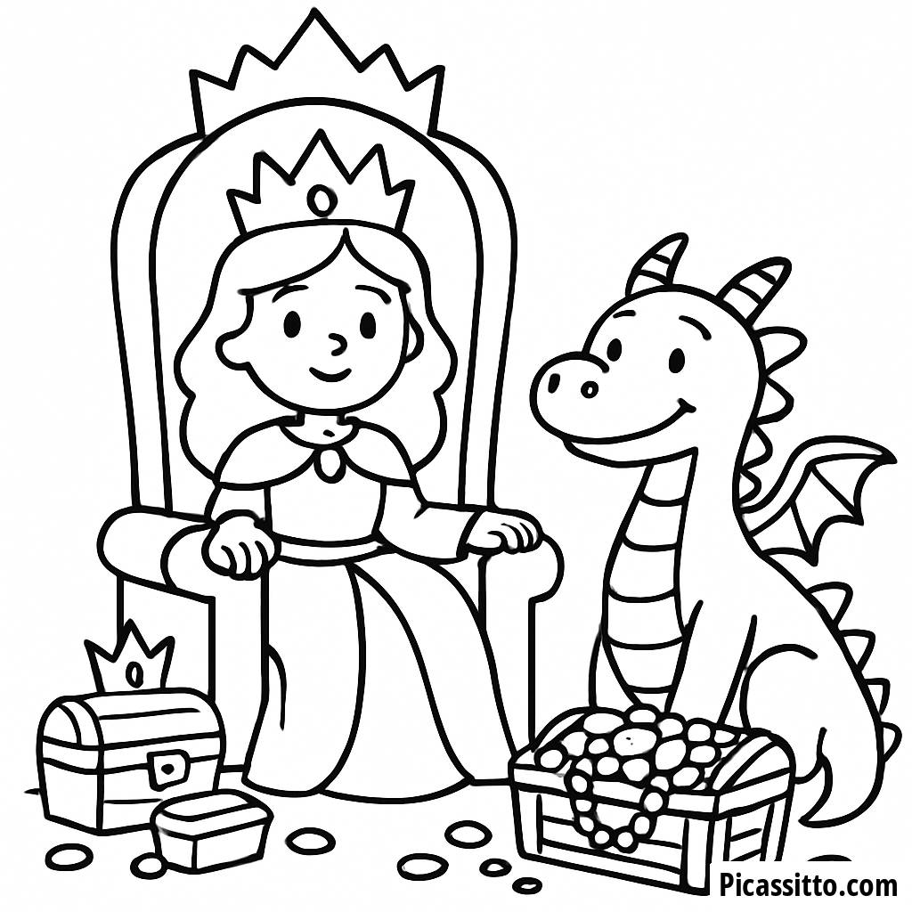 Download this free and printable majestic queen coloring page, featuring a beautiful queen on her grand throne surrounded by dazzling jewels and a friendly dragon.