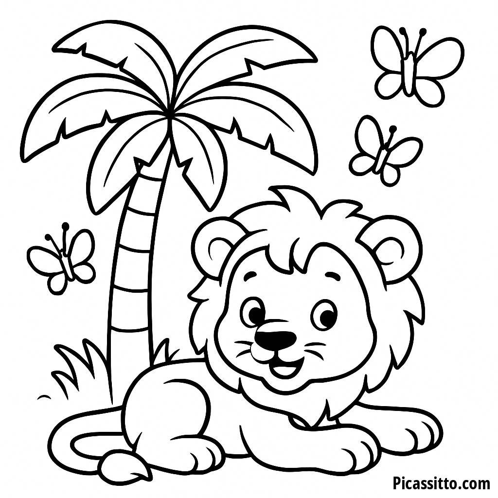 Enjoy this free and printable coloring page featuring a playful lion cub lounging under a palm tree, surrounded by butterflies!