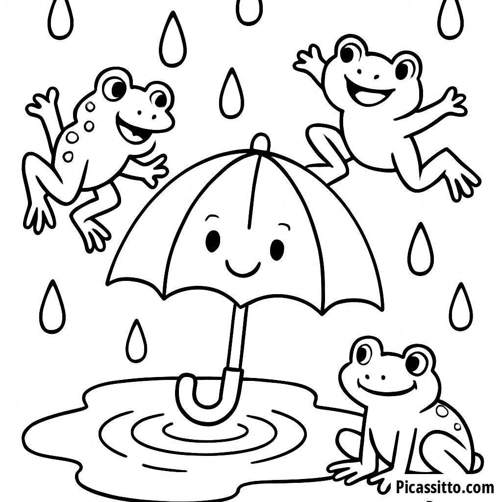 Enjoy this free and printable coloring page featuring raindrops, a cute umbrella, and playful frogs jumping around puddles. Perfect for kids who love weather-themed activities!